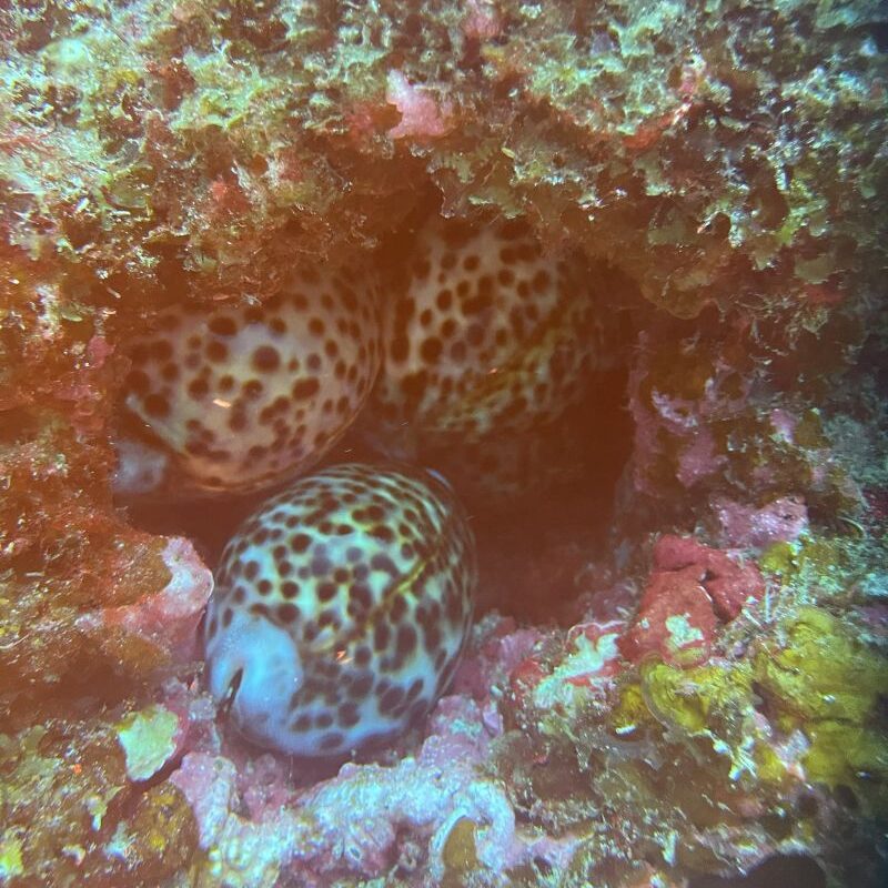 ラチャノイ島マンタベイでは岩珊瑚の隙間にタカラガイがぎっしり詰まってました。